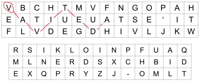 Commencez en haut à gauche pour la 1ère lettre, puis poursuivez en … zig-zag ! Vous trouverez : V A V I T E D …