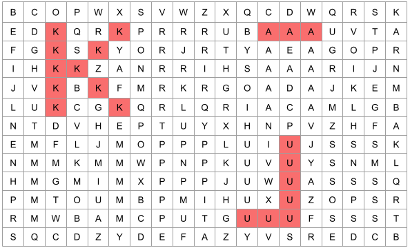 Grisez toutes les cases ou vous voyez les mêmes lettres côte à côte, y compris en diagonale.